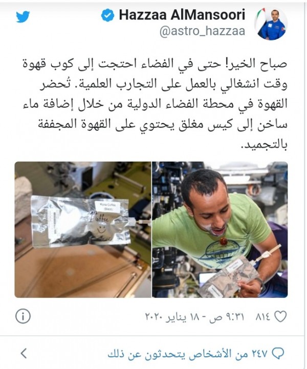 .نشر هزاع المنصوري تغريدة على موقع "تويتر" والذي أظهر فيها صورته وهو يحضر القهوة داخل محطة الفضاء الدولية.هزاع كتب : " صباح الخير!حتى في الفضاء احتجت إلى كوب قهوة وقت انشغالي بالعمل على التجارب العلمية تحضر القهوة في محطة الفضاء الدولية. من خلال إضافة ماء ساخن إلى كيس مغلق يحتوي على القهوة المجففة بالتجميد".يعتبر هزاع المنصوري هو أول رائد فضاء إماراتي وقد وصل إلى المحطة الفضائية الدولية على متن مركبة "سويوز إم إس-15"،و التي التحمت بالمحطة في ٢٥ سبتمبر الماضي، وقضى هناك ٨ أيام وعاد إلى الأرض في ٣ أكتوبر الماضي، على متن مركبة "سويوز إم إس-12".