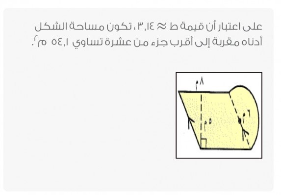حل سؤال على اعتبار أن قيمة ط ≈ 3 14 تكون مساحة الشكل أدناه مقربة إلى أقرب جزء من عشرة تساوي 54 1 م 2.