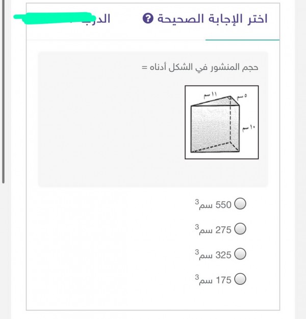 أختر الإجابة الصحيحة حجم المنشور في الشكل أدناه تساوي الجواب حجم المنشور = 275 سم2.