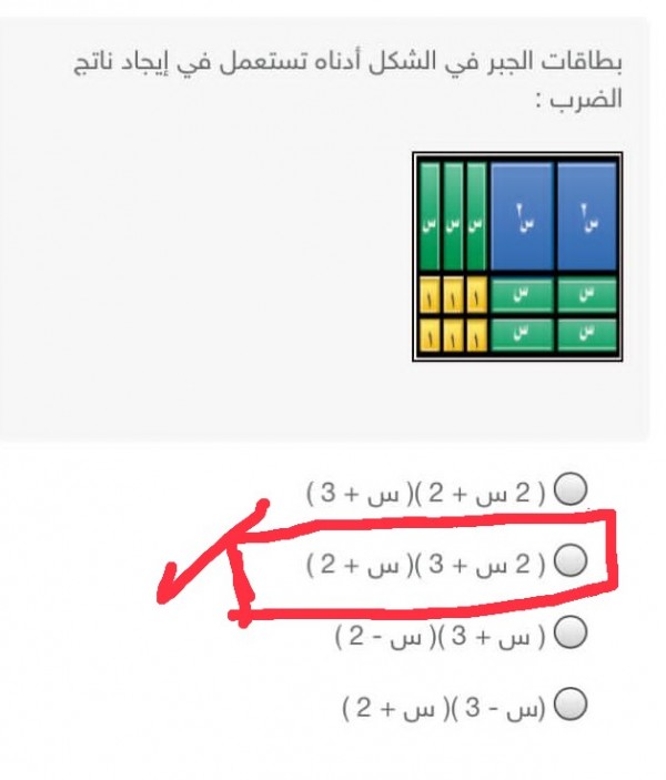 بطاقات الجبر في الشكل أدناه تستعمل في ايجاد ناتج الضرب ثالث متوسط