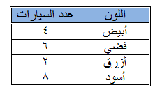 الجواب هو نسبة عدد السيارات البيضاء إلى العدد الكلي للسيارات هو 1/5