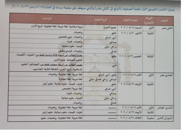 جدول الاختبار التقييمي الاول لطلبة جميع الصفوف من رابع الى الثاني عشر والذي سيعقد على منصة درسك في الفترة 18 / 4 وحتى 23 / 4 / 2020.
