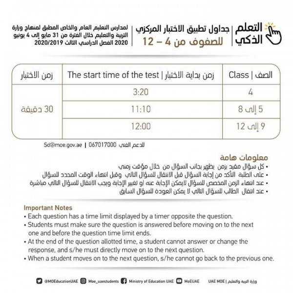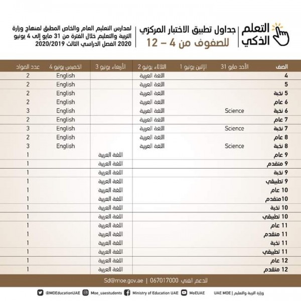 جداول تطبيق الاختبار المركزي للتعليم العام بالإمارات الحكوميه والخاصه.